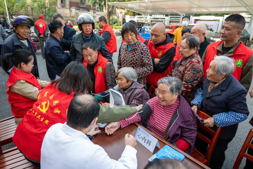 10月28日,在浙江省湖州市長興縣水口鄉水口村,醫護人員和志願者為老人提供健康服務。