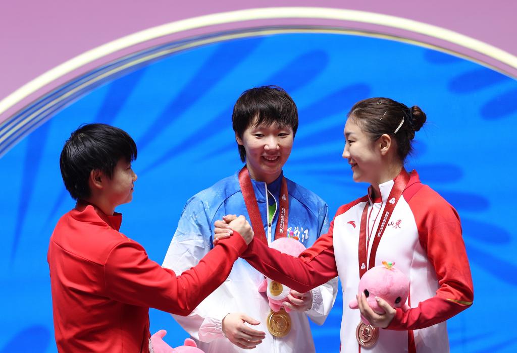 ——十五運會乒乓球女單決賽中,黑龍江隊王曼昱4:2戰勝河北隊孫穎莎奪冠。王曼昱賽後&&,兩人平時在訓練比賽中互相激勵,在良性競爭中讓彼此變得更好。
