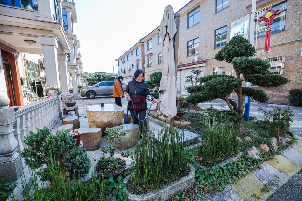 11月19日,呂山鄉龍溪村的村民在給自家庭院的綠植澆水。