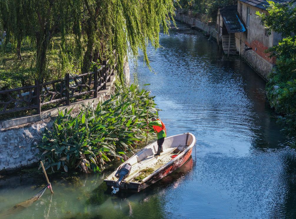 11月19日,呂山鄉呂山村的保潔人員乘船進行河道日常保潔作業。