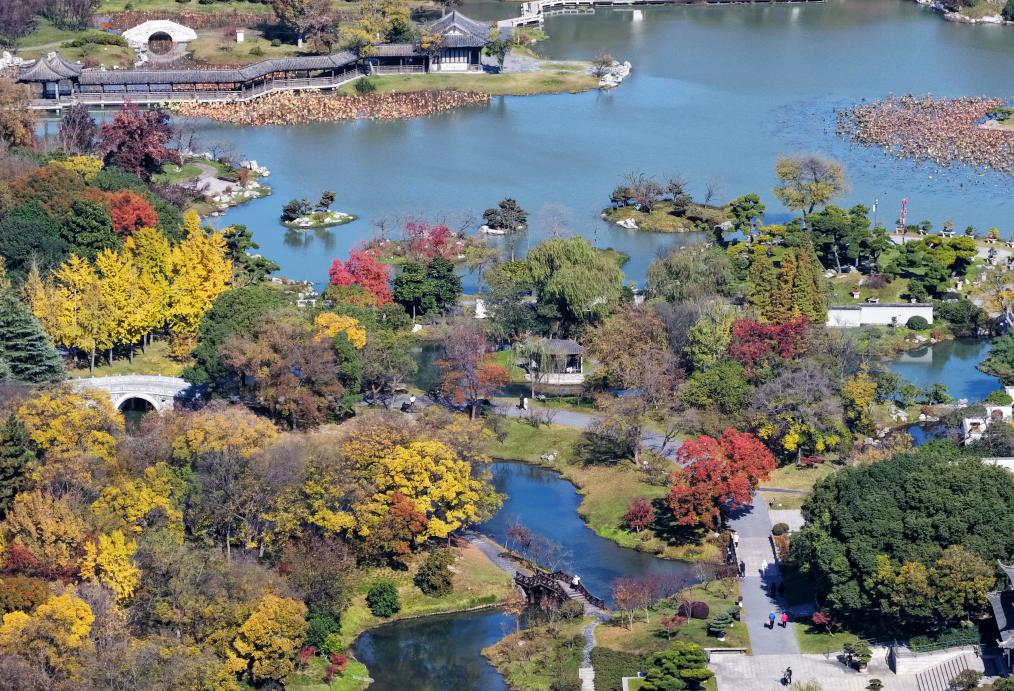 11月19日,游客在江蘇省蘇州市拙政園游玩(無人機照片)。