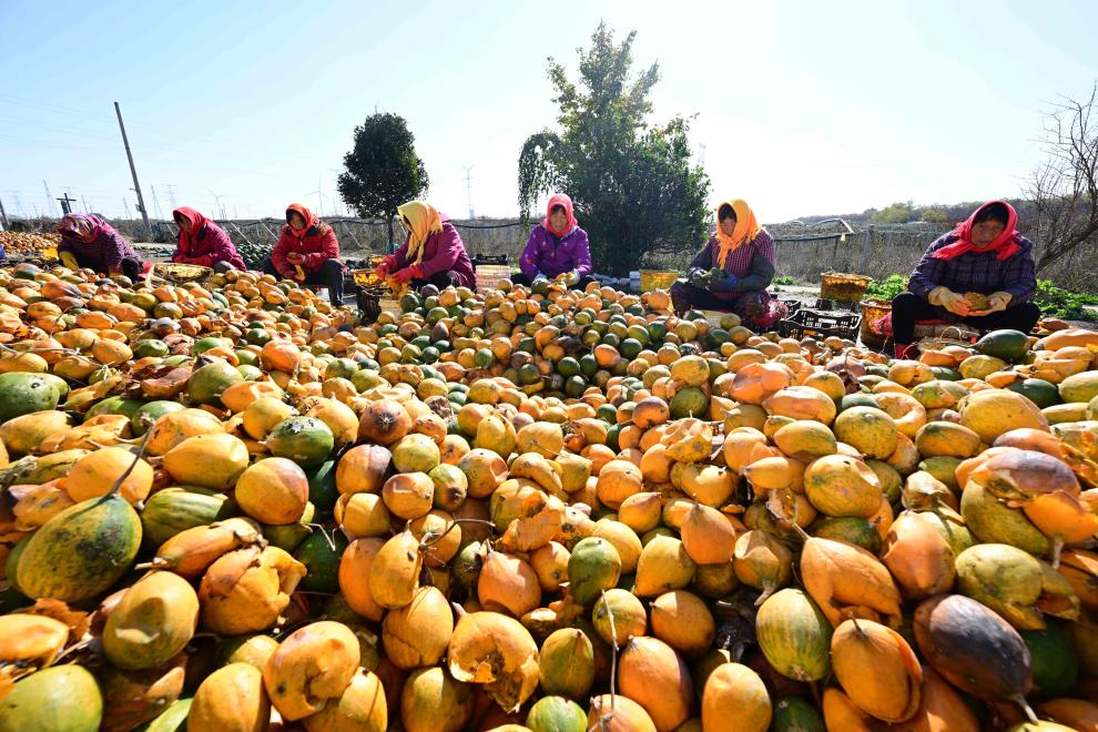 11月19日,江蘇省淮安市金湖縣銀涂鎮十里果林千畝吊瓜園工作人員正在挑揀吊瓜。