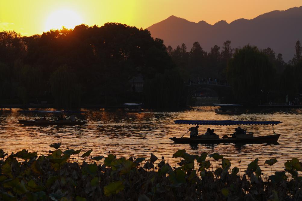 11月20日在杭州西湖景區孤山附近拍攝的落日景色。