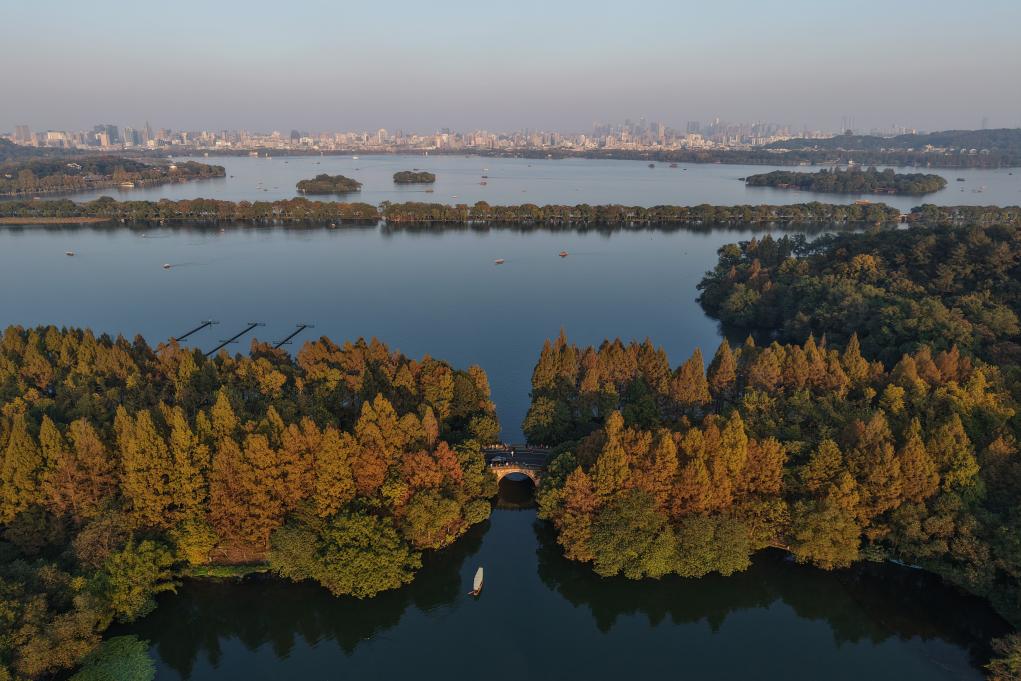 11月21日拍攝的杭州西湖景區楊公堤附近的景色(無人機照片)。