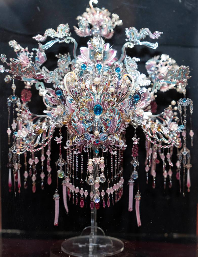 這是11月21日在北京故宮文創融合館舉行的“海派匠心·藝韻共融”上海市殘疾人文化藝術作品展上拍攝的“紫鸞鳳冠”作品。