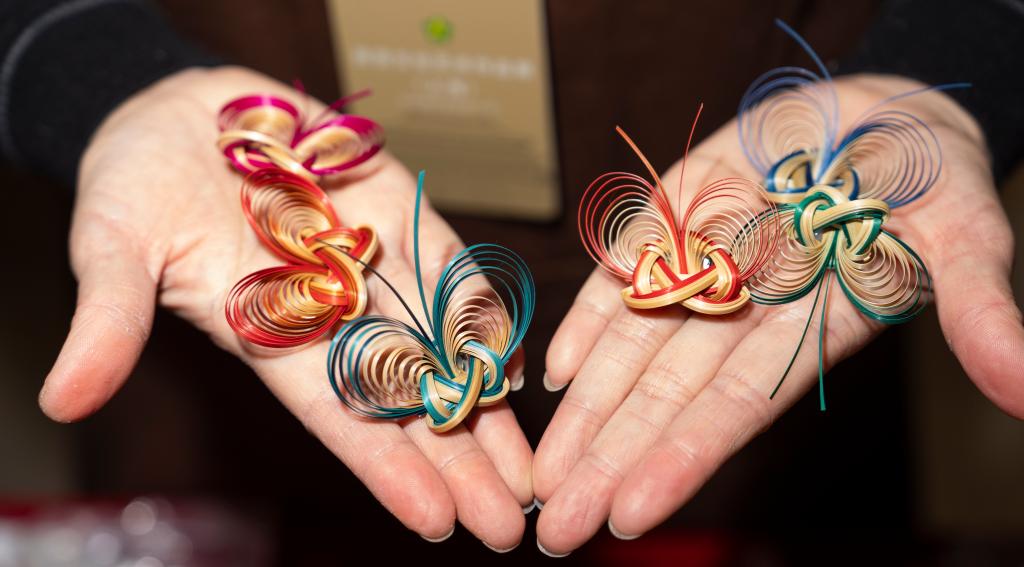 11月21日,在北京故宮文創融合館舉行的“海派匠心·藝韻共融”上海市殘疾人文化藝術作品展上,一名藝術家展示竹編作品。