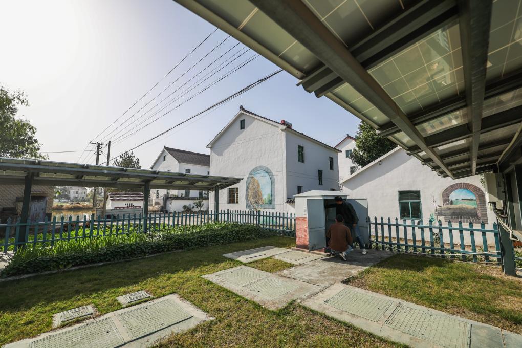 11月25日,工作人員在巡查和平鎮長城村生活污水處理設施,該設施用太陽能光伏設備收集的電能處理生活污水。
