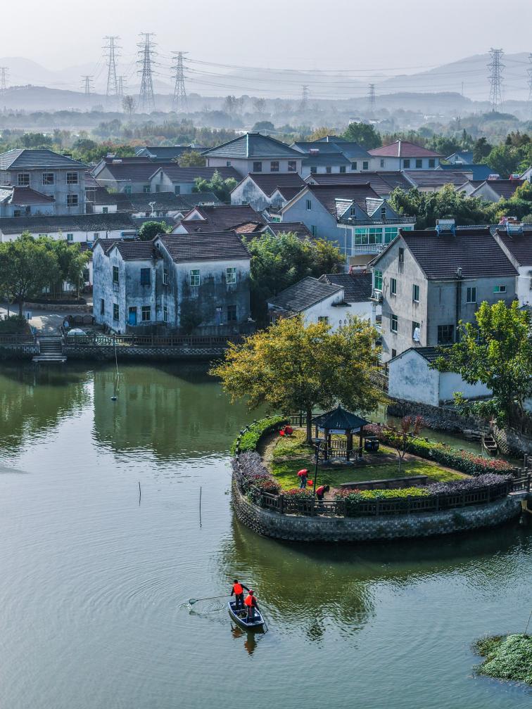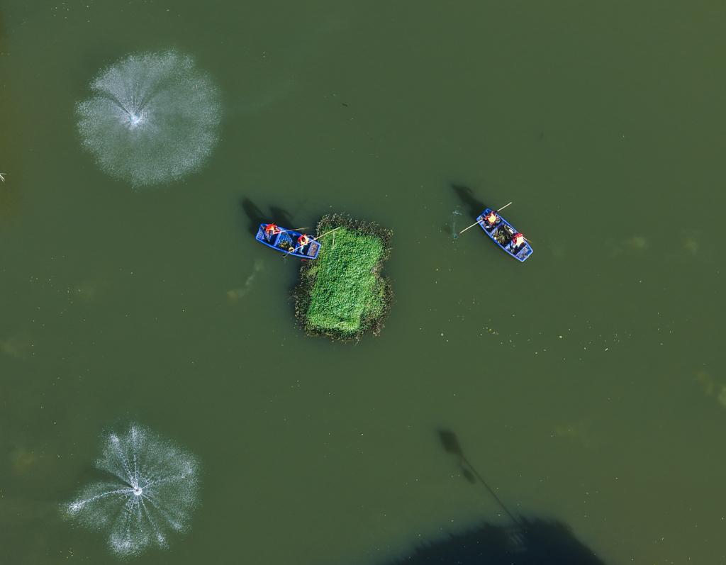 11月25日,和平鎮長城村保潔人員乘船打撈水面漂浮物(無人機照片)。