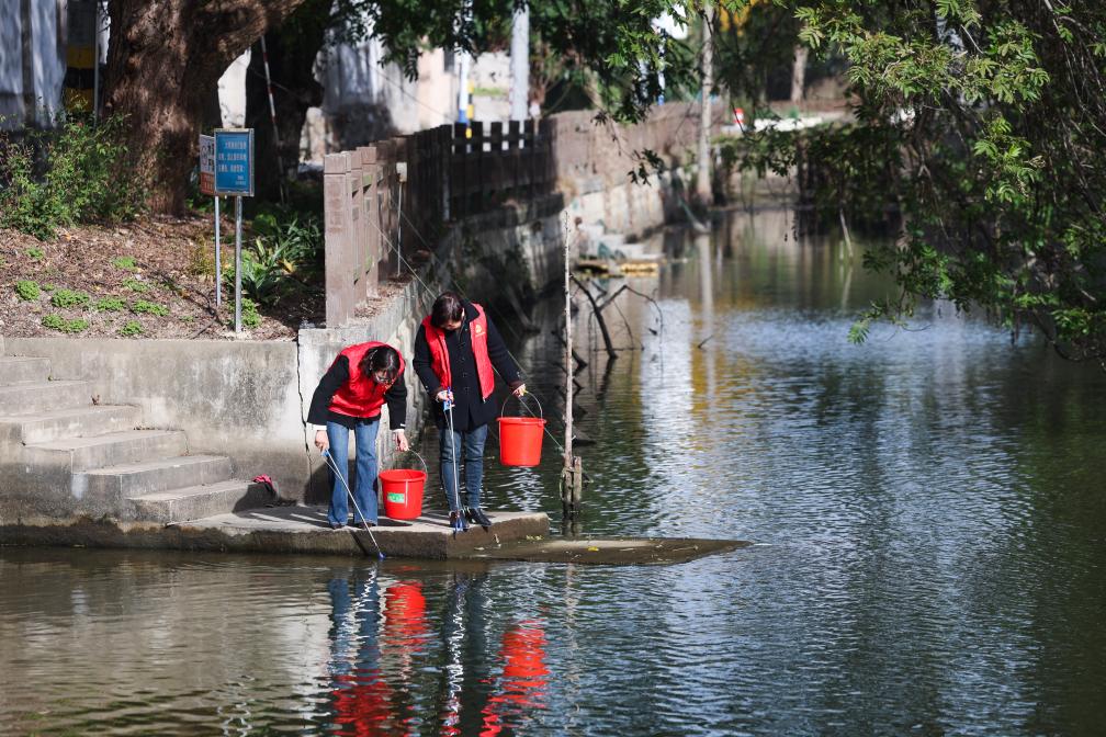 11月25日,和平鎮長城村黨員志願者在河岸旁清理漂浮物。