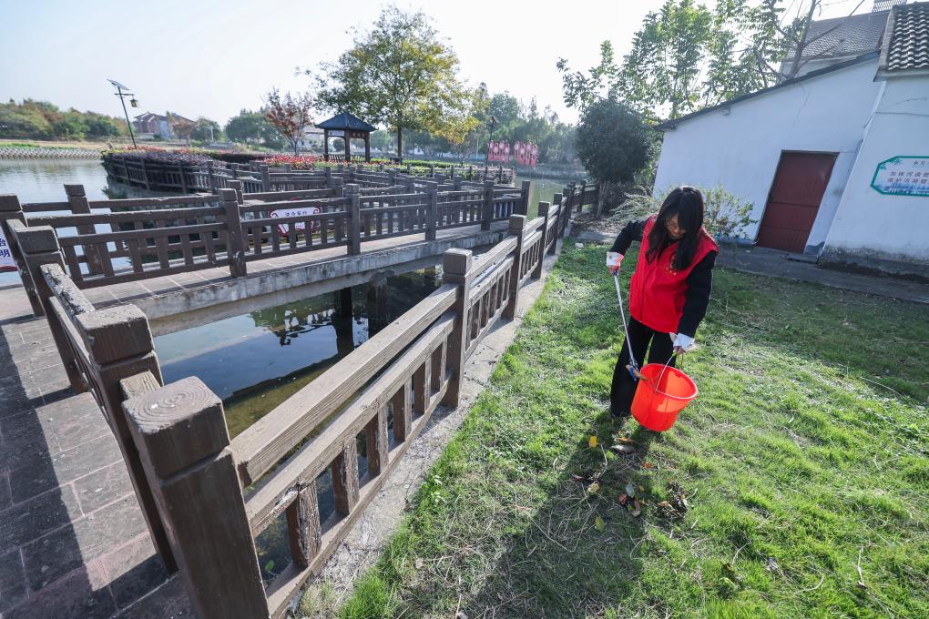 11月25日,和平鎮長城村黨員志願者在河岸旁清理垃圾雜物。