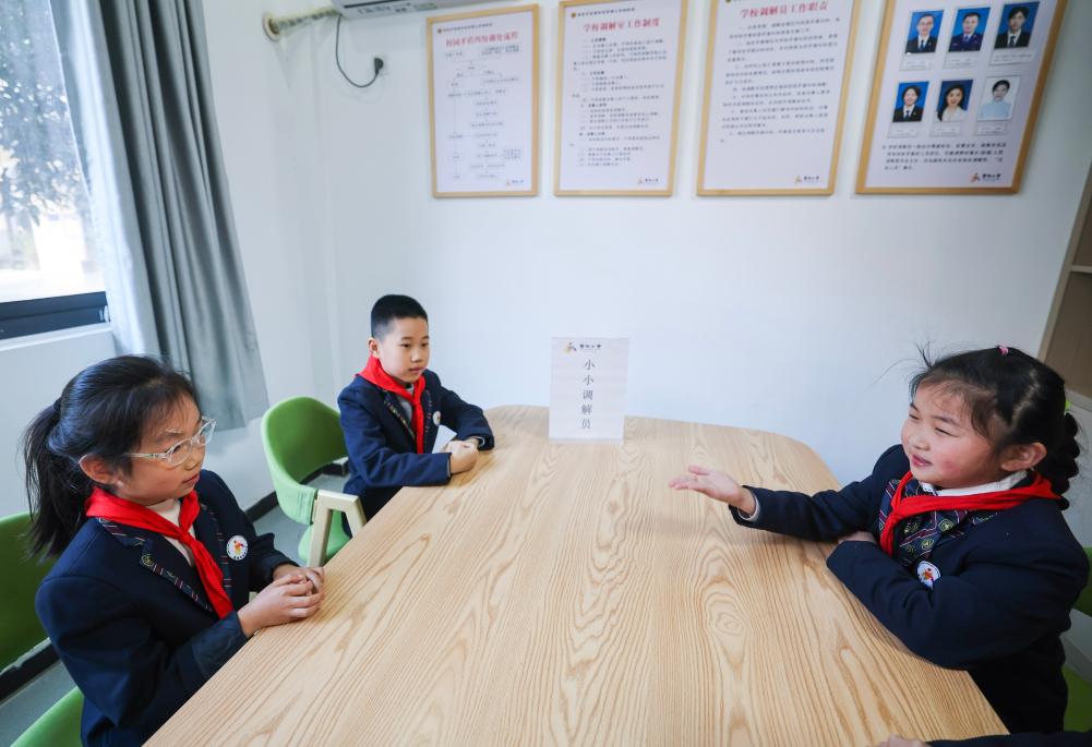 12月9日,在暨南街道中心學校暨南小學的矛盾調解室,學生調解員(右一)在調解同學間的小矛盾、小糾紛,這也是學校培養學生法治意識和調解能力的方式之一。