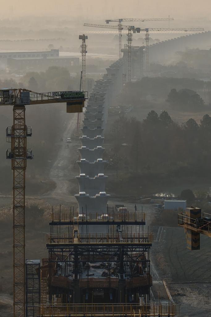 12月20日清晨拍攝的通甬高鐵嘉興特大橋施工現場(無人機照片)。