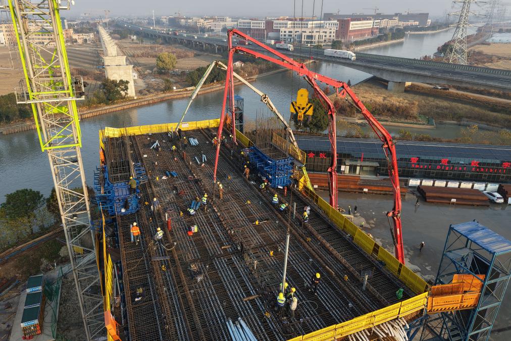 12月20日拍攝的通甬高鐵嘉興特大橋跨杭申線航道矮塔斜拉橋連續梁0號塊澆築施工現場(無人機照片)。