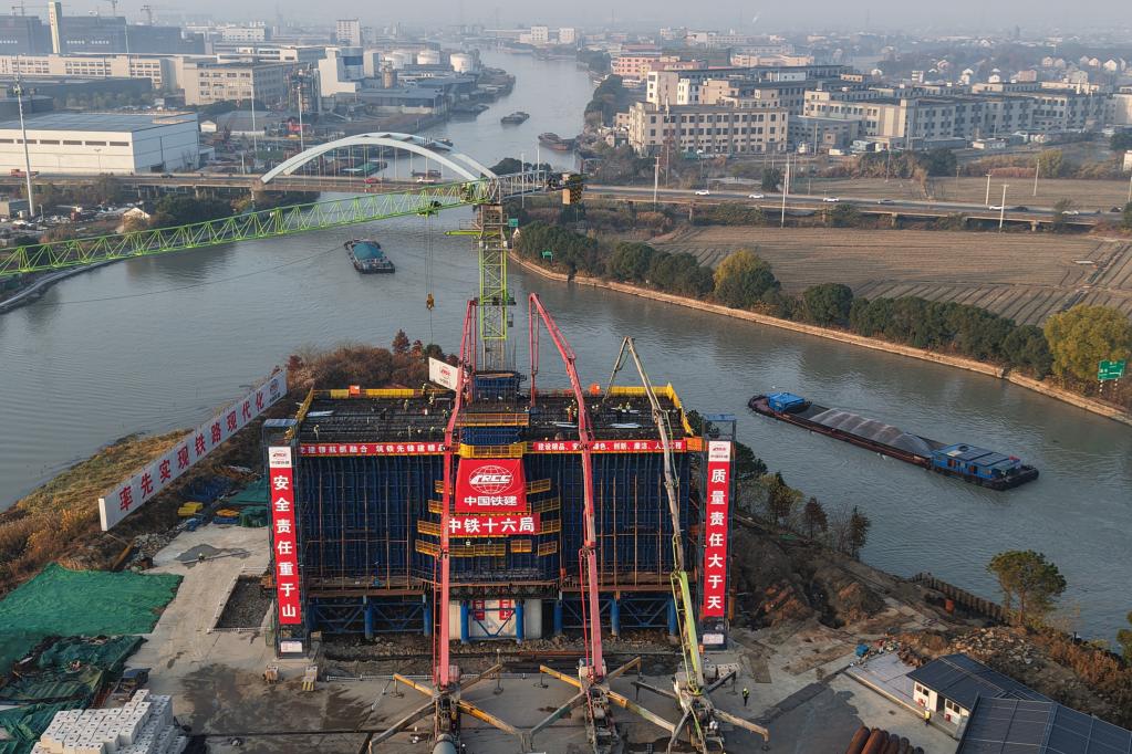 12月19日起,位於浙江省嘉興市南湖區的新建南通至寧波高速鐵路(簡稱通甬高鐵)嘉興特大橋跨杭申線航道矮塔斜拉橋連續梁0號塊持續進行澆築施工,將為後續橋樑上部結構推進奠定基礎。