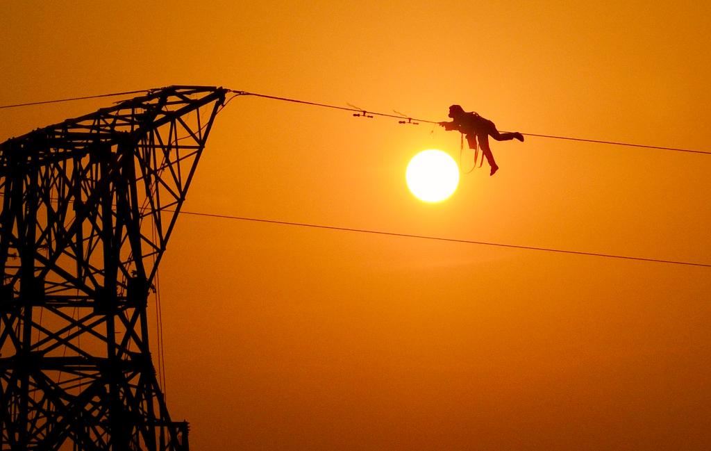 12月16日,施工人員在香澗至鷺島500千伏線路工程施工現場進行高空作業(無人機照片)。12月17日,由安徽送變電工程有限公司施工的安徽香澗至鷺島500千伏線路工程順利實現主體完工。