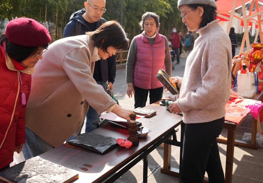 1月15日,社區居民在暖冬集市上體驗雕版印刷。