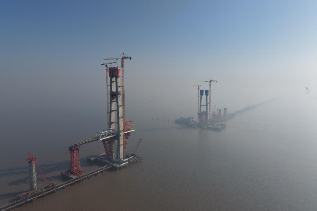 1月16日拍攝的杭州灣跨海鐵路橋北航道橋8號主塔(無人機照片)。