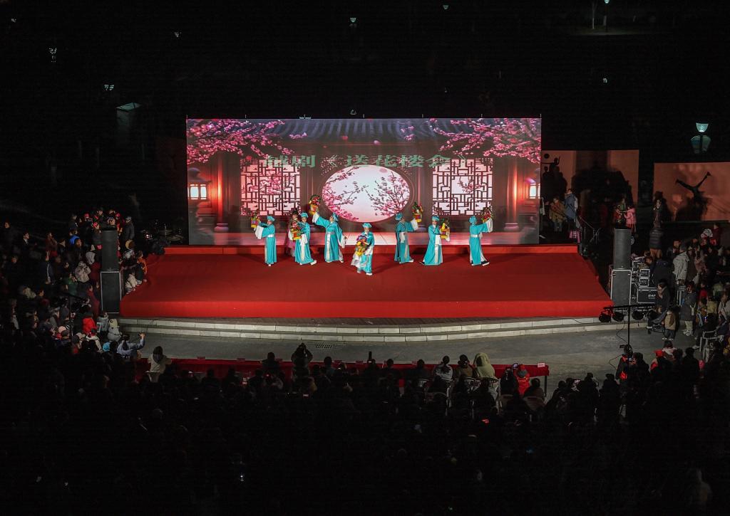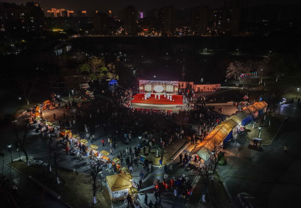 1月23日,文藝愛好者在陶朱街道友誼社區王家湖公園的“我們的村晚”上表演戲曲節目(無人機照片)。