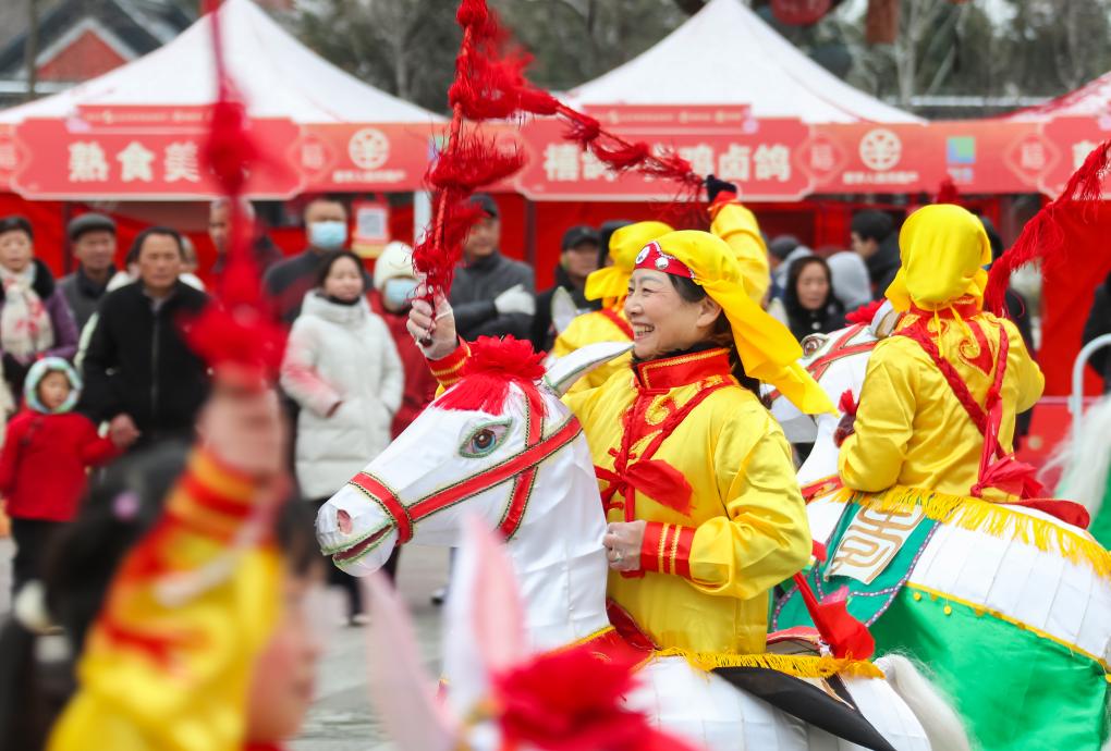 2月7日,民間藝人在江蘇省句容市舉辦的年貨大集活動中表演“馬燈陣舞”。