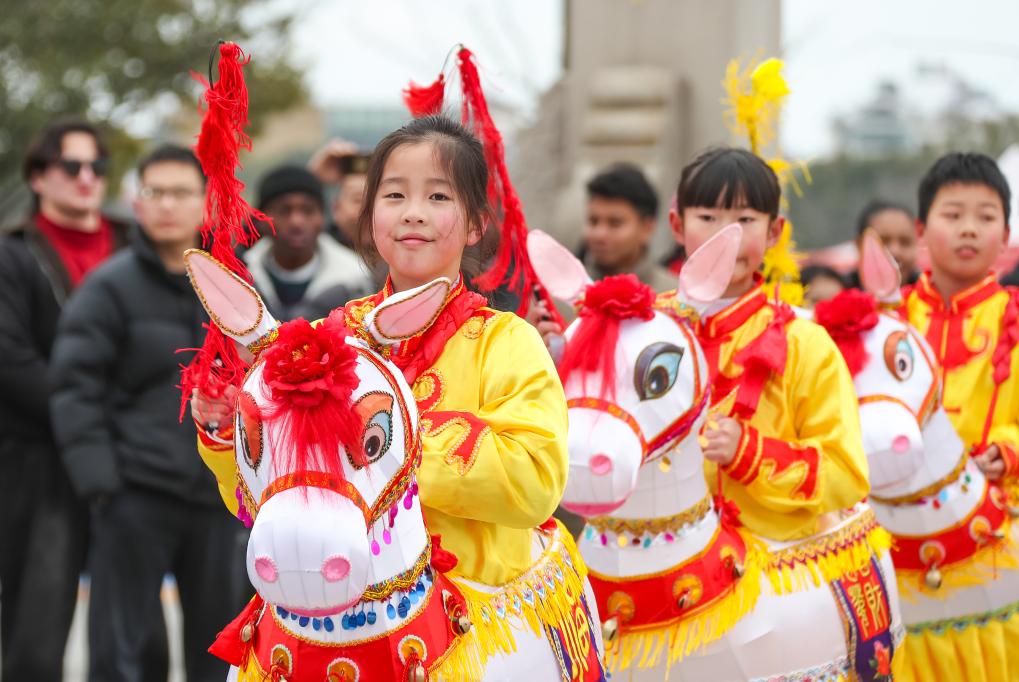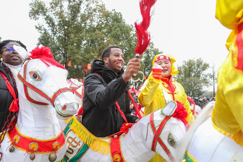 2月7日,外國留學生在江蘇省句容市舉辦的年貨大集活動中體驗“馬燈陣舞”表演。