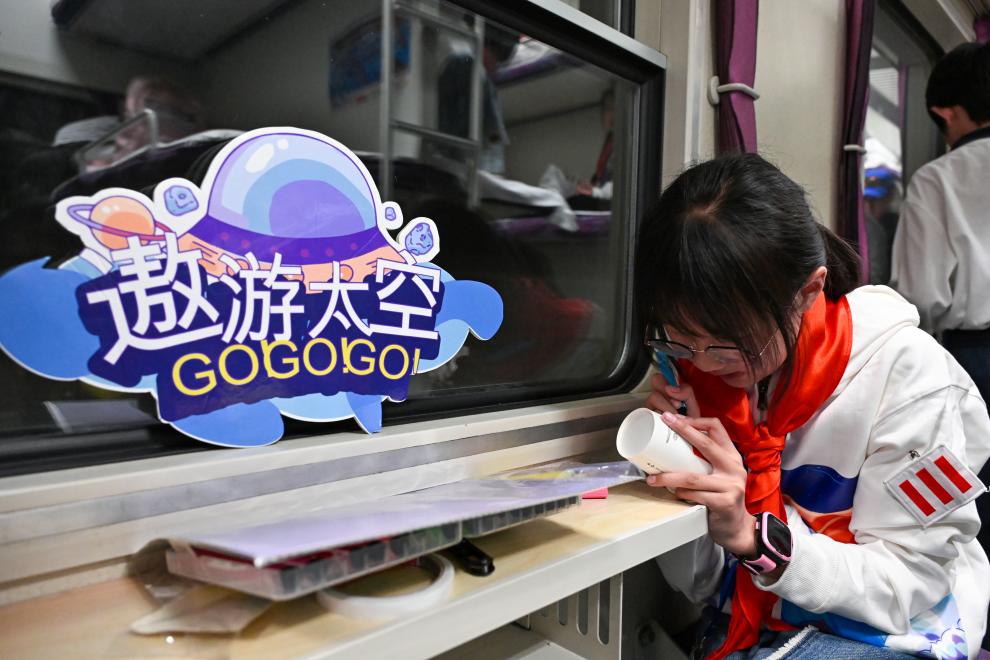 4月22日,來自全國多地的少先隊員從蘭州西站啟程,搭乘火車駛向中國酒泉衛星發射中心。新華社發(朱雪超 攝)