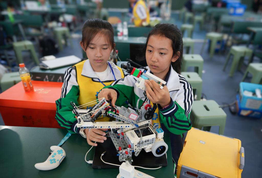 5月31日,兩名參賽選手在全國青少年科技教育成果展示大賽雲南省區域賽上調試比賽用的機器人。新華社記者 陳欣波 攝