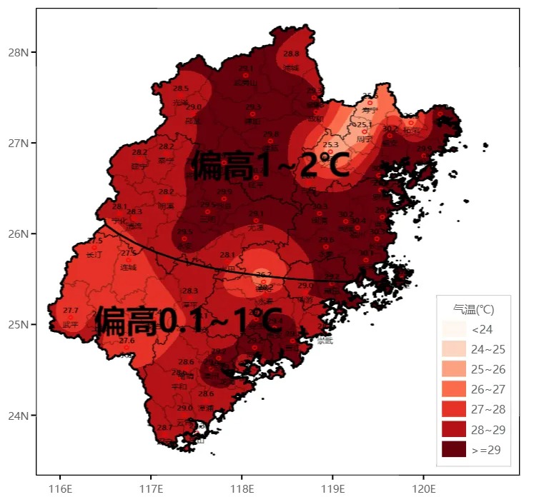 氣象部門預計,8月福建平均氣溫大部分縣(市、區)城區為27.5℃~30.5℃,鷲峰山脈城區為25℃~26℃,中北部地區偏高1℃~2℃,南部地區偏高0.1℃~1℃。極端最高氣溫偏高,內陸縣(市、區)城區38℃~40℃,沿海縣(市、區)城區36℃~39℃,鷲峰山脈城區32.5℃~34.5℃;≥35℃高溫日數偏多。持續性高溫過程大致出現在8月1日至8日和13日至25日。