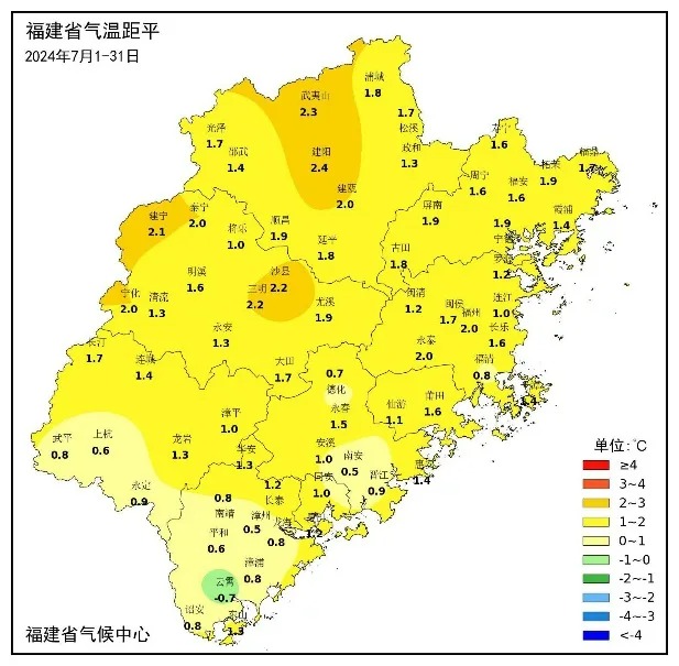 福建氣象部門數據顯示,7月,福建全省平均氣溫29.5℃,偏高1.4℃,為1961年以來歷史同期第二高。除雲霄偏低0.7℃外,全省其餘各地平均氣溫均偏高,10個縣(市、區)城區偏高2℃以上,以建陽偏高2.4℃為最。7月3日至24日,福建經歷1次大範圍高溫過程,共55個縣(市、區)城區日最高氣溫≥37℃,中北部多地出現40℃及以上的高溫,月極端最高氣溫為40.8℃,出現在福州市區(19日)。該過程持續時間和範圍均為1961年以來歷史第三,達極端高溫事件標準。