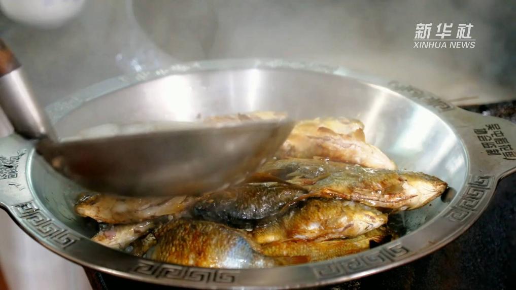 在田裏撈起一尾鮮稻花魚,配上辣椒、青豆、芋頭等食材,文火慢燉,淡淡的柴火氣有种家的溫暖。