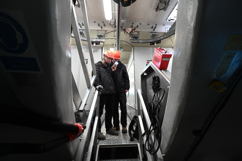 我攀爬到了平台,為了躲避涼颼颼的海風,迅速跑進塔基室內,並跟隨運維員黃志明、鄭桂雄進入百米高漆黑的風機機艙裏,他們打開電筒立刻投入複雜的電路設備檢修。