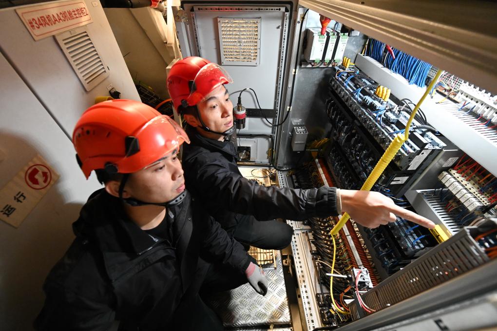 1月19日,黃志明(右)和同事在風機機艙內進行故障處理。