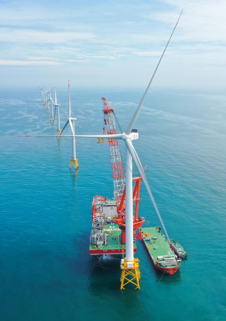 福建北部海域全球首&16兆瓦海上風電機組吊裝完成現場(2023年6月28日攝)。