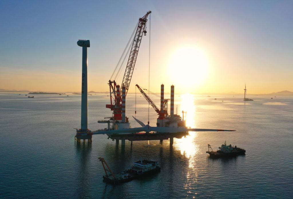三峽集團福建福清興化灣二期海上風電場10兆瓦風機葉片吊裝中(2020年6月13日攝)。