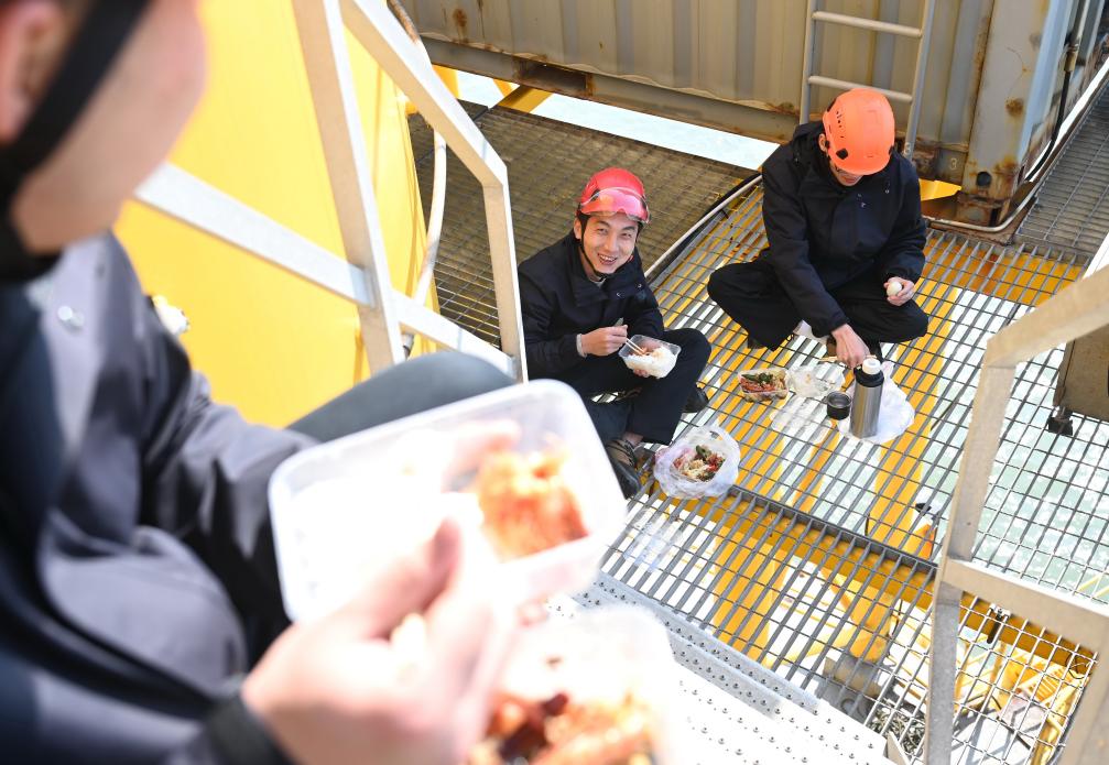 1月19日,黃志明(中)和同事在海上風電塔基上吃着從岸上帶來的午餐。