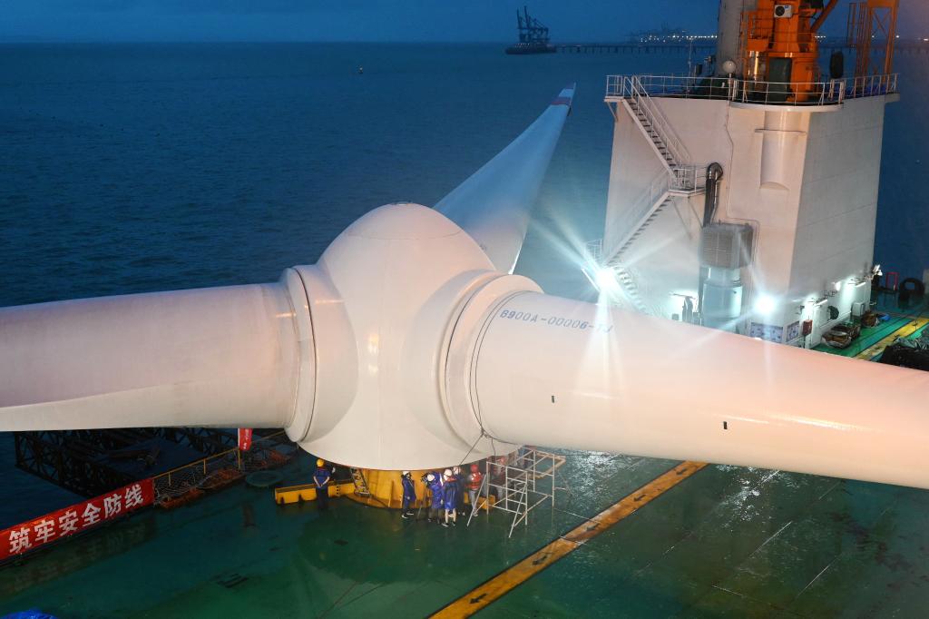 這是在三峽集團福建福清興化灣二期海上風電場準備吊裝的10兆瓦風機葉片(2020年6月8日攝)。