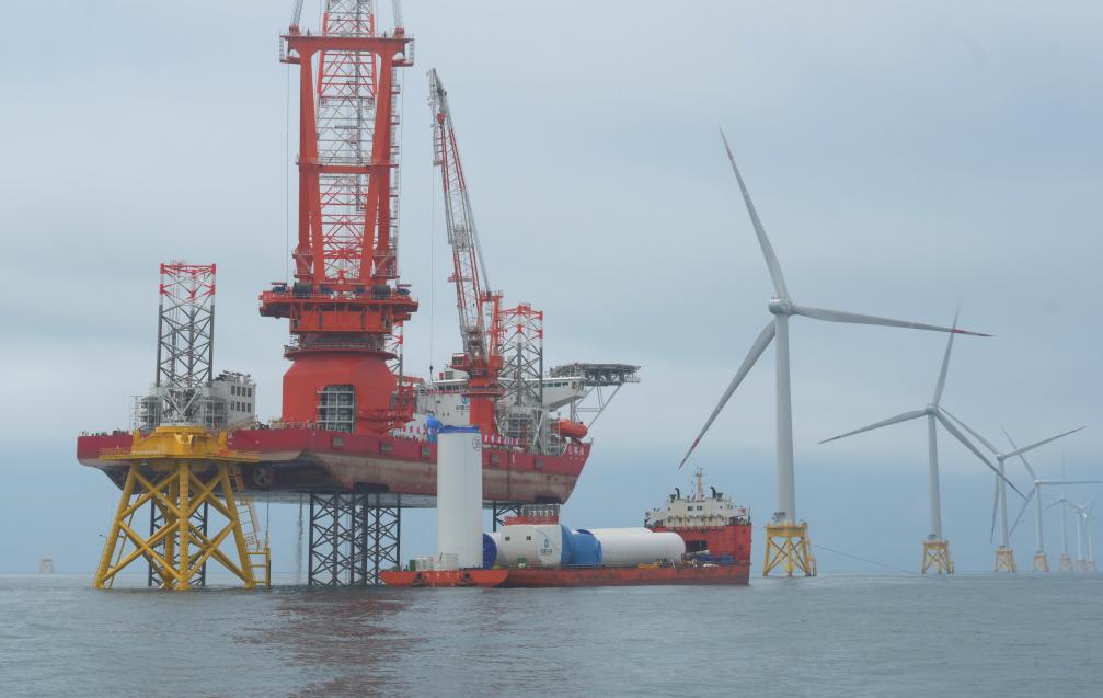 這是在福建北部海域16兆瓦超大容量海上風電機組塔筒吊裝現場(2023年6月24日攝)。
