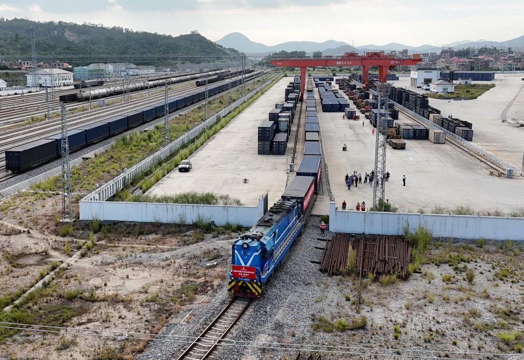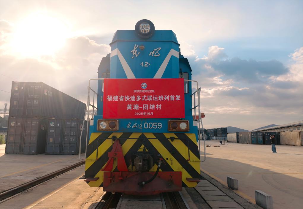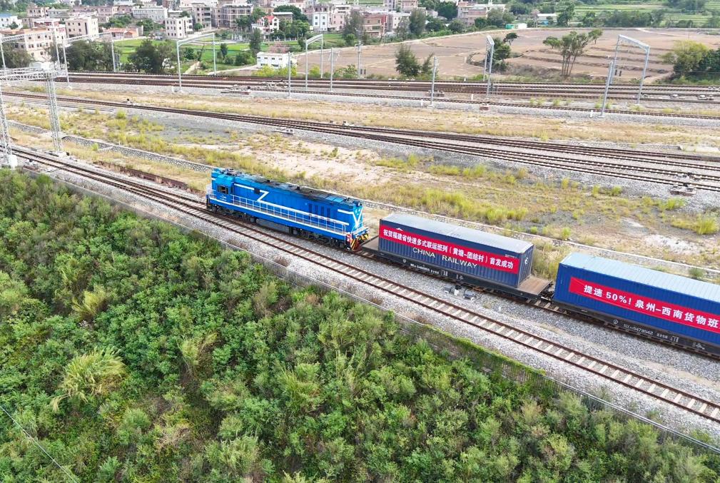 10月10日,一列裝載25個集裝箱輕工産品的X8666次快速多式聯運班列從福建省泉州市黃塘鐵路貨場駛出,以最高120公里時速開往重慶團結村站。這標誌着福建省首列快速多式聯運班列正式開行。新華社發