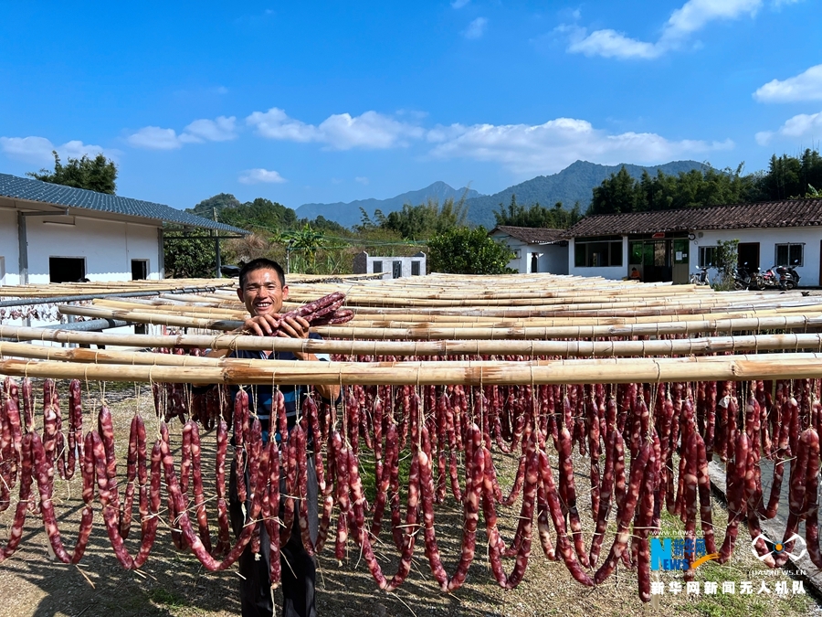 生曬臘味是當地人的傳統,村民正在制臘味。新華網發(羅素玲 攝)