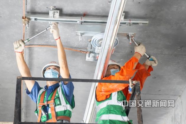 機場東車輛段接觸網工程,是全國地鐵系統直流供電方式中首次採用吊柱加鋁合金旋轉腕臂的新型安裝方式,技術標準高、施工難度大。面對新技術、新標準、新挑戰,項目部全力以赴、攻堅克難,通過利用全站儀的精確測量和現場模擬的精準計算,解決了在無軌條件下吊柱等測量和安裝的精確度,減少了材料的浪費,實現了工期節點要求。