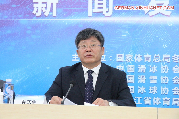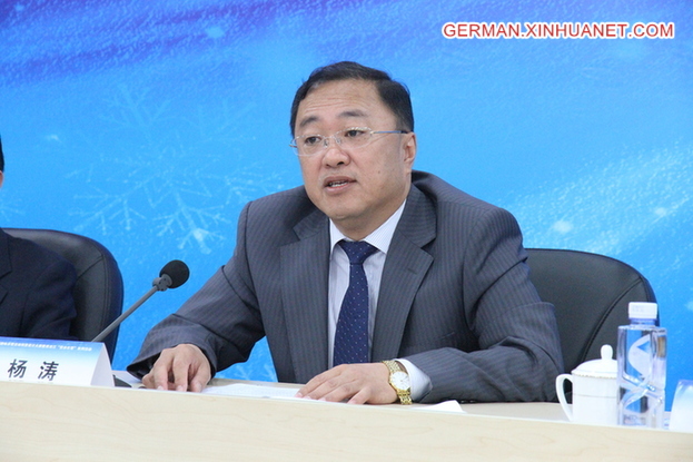 Yang Tao, Direktor des Sport-Büros der chinesischen Provinz Heilongjiang, stellt die Inhalte der Veranstaltung „Spaß bei Eis und Schnee genießen“ vor