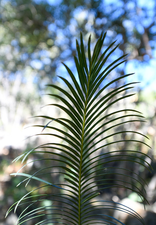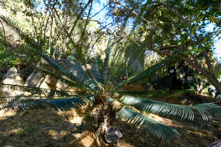 CHENGDU, 8. Dezember 2022 (Xinhua) -- Das Foto zeigt einen Palmfarn im nationalen Naturschutzgebiet für Palmfarne in Panzhihua in der Provinz Sichuan im Südwesten Chinas, 28. November 2022. Die Stadt Panzhihua verfügt über Chinas einziges nationales Naturschutzgebiet für Palmfarne, das aus mehr als 385.000 Exemplaren der Pflanze besteht. Lokale Behörden und Panzhihua Iron and Steel haben ihre Anstrengungen zum Schutz von Palmfarnen im Zuge der grünen Entwicklung und Bestrebungen der Stadt zur Wiederherstellung von Ökosystemen verstärkt. Bergbauaktivitäten wurden in dem Naturschutzgebiet unterbunden. Gebirge, die aufgrund des Bergbaus kahl waren, leuchten inzwischen wieder grün. (Xinhua/Xu Bingjie)