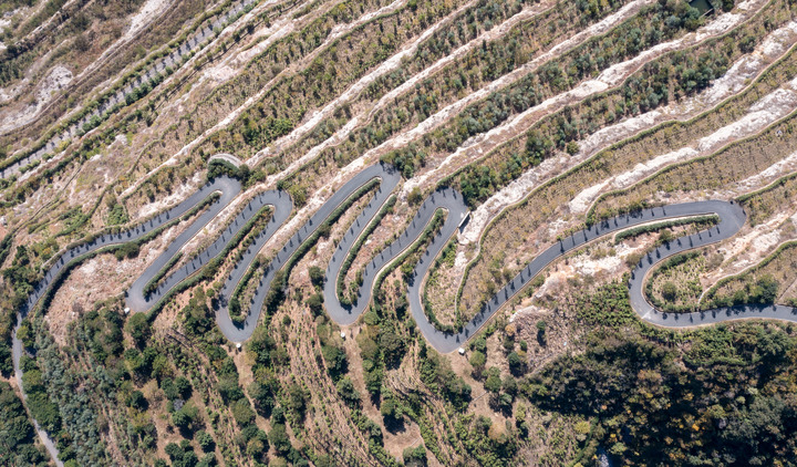 CHENGDU, 8. Dezember 2022 (Xinhua) -- Die Luftaufnahme zeigt eine geteerte Straße in einem Bergbaugebiet nach der ökologischen Sanierung in einem nationalen Naturschutzgebiet für Palmfarne in Panzhihua in der Provinz Sichuan im Südwesten Chinas, 28. November 2022. Die Stadt Panzhihua verfügt über Chinas einziges nationales Naturschutzgebiet für Palmfarne, das aus mehr als 385.000 Exemplaren der Pflanze besteht. Lokale Behörden und Panzhihua Iron and Steel haben ihre Anstrengungen zum Schutz von Palmfarnen im Zuge der grünen Entwicklung und Bestrebungen der Stadt zur Wiederherstellung von Ökosystemen verstärkt. Bergbauaktivitäten wurden in dem Naturschutzgebiet unterbunden. Gebirge, die aufgrund des Bergbaus kahl waren, leuchten inzwischen wieder grün. (Xinhua/Xu Bingjie)