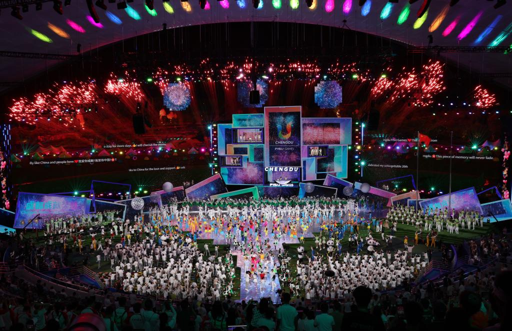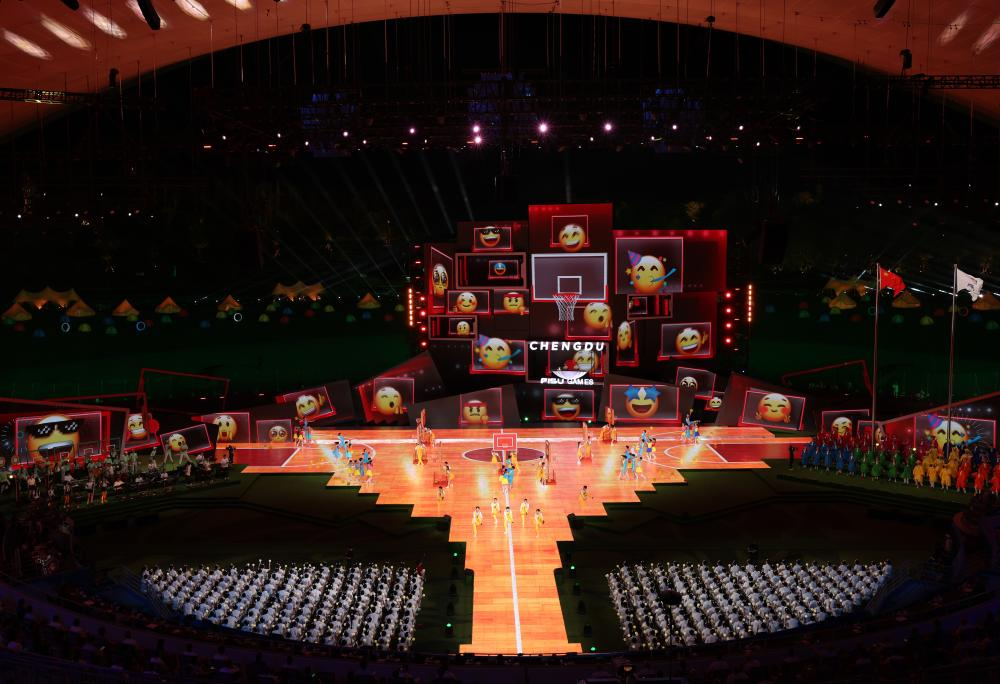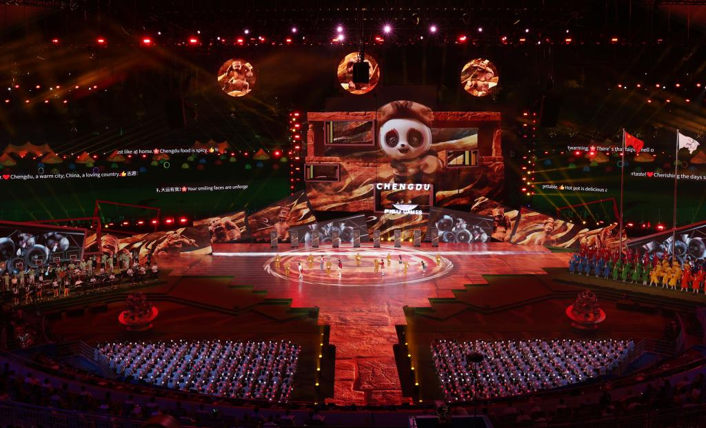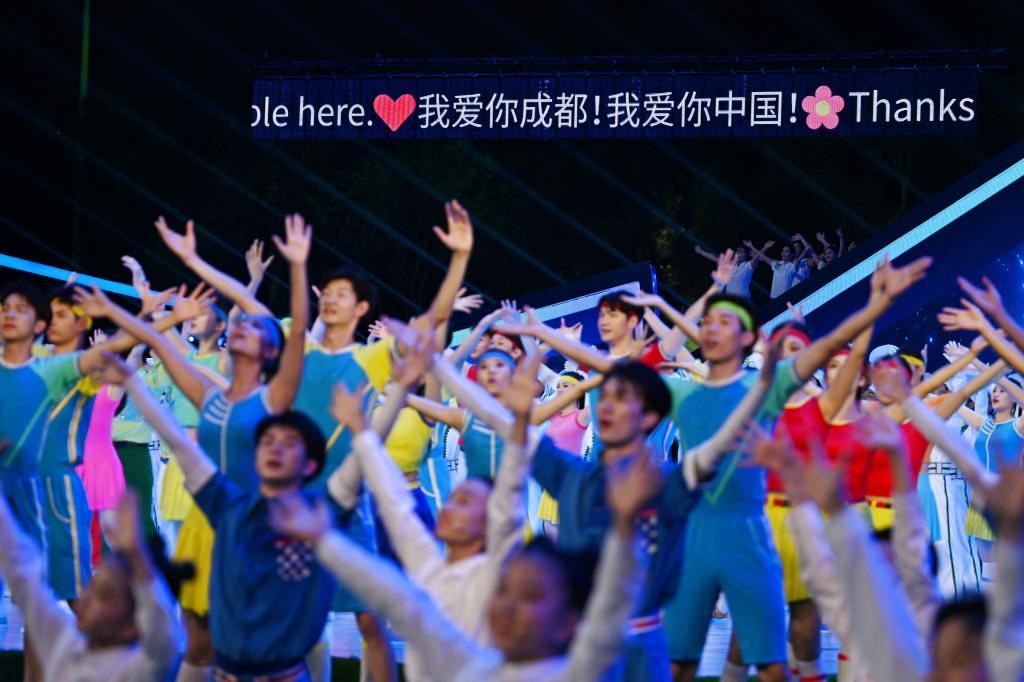CHENGDU, 8. August 2023 (Xinhuanet) -- Eine Aufführung findet während der Abschlusszeremonie der 31. FISU Summer World University Games in Chengdu in der südwestchinesischen Provinz Sichuan statt, 8. August 2023. (Quelle: Xinhua/Jiang Hongjing)