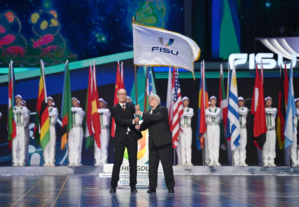 CHENGDU, 8. August 2023 (Xinhuanet) -- Der amtierende FISU-Präsident Leonz Eder und FISU-Generalsekretär und CEO Eric Saintrond halten die Fahne bei der Übergabezeremonie der FISU-Fahne während der Abschlusszeremonie der 31. FISU Summer World University Games in Chengdu in der südwestchinesischen Provinz Sichuan, 8. August 2023. (Quelle: Xinhua/Zhang Long)