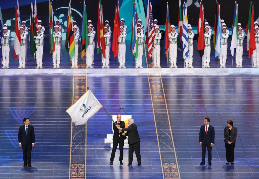 CHENGDU, 8. August 2023 (Xinhuanet) -- Der amtierende FISU-Präsident Leonz Eder (2. v. l.) und FISU-Generalsekretär und CEO Eric Saintrond (3. v. r.) halten die Fahne bei der Übergabezeremonie der FISU-Fahne während der Abschlusszeremonie der 31. FISU Summer World University Games in Chengdu in der südwestchinesischen Provinz Sichuan, 8. August 2023. (Quelle: Xinhua/Jiang Hongjing)