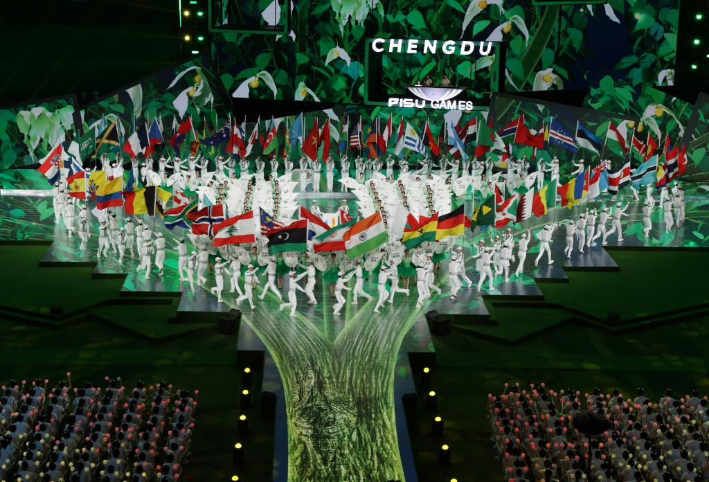 CHENGDU, 8. August 2023 (Xinhuanet) -- Fahnen- und Plakatträger paradieren während der Abschlusszeremonie der 31. FISU Summer World University Games in Chengdu in der südwestchinesischen Provinz Sichuan, 8. August 2023. (Quelle: Xinhua/Jiang Hongjing)