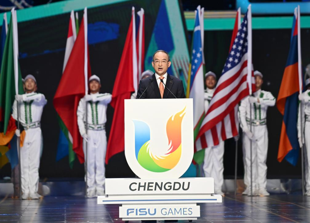 CHENGDU, 8. August 2023 (Xinhuanet) -- Der amtierende FISU-Präsident Leonz Eder hält eine Rede während der Abschlusszeremonie der 31. FISU Summer World University Games in Chengdu in der südwestchinesischen Provinz Sichuan, 8. August 2023. (Quelle: Xinhua/Zhang Long)