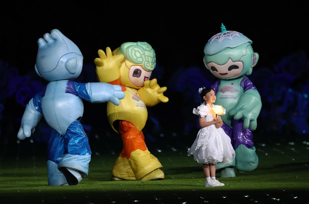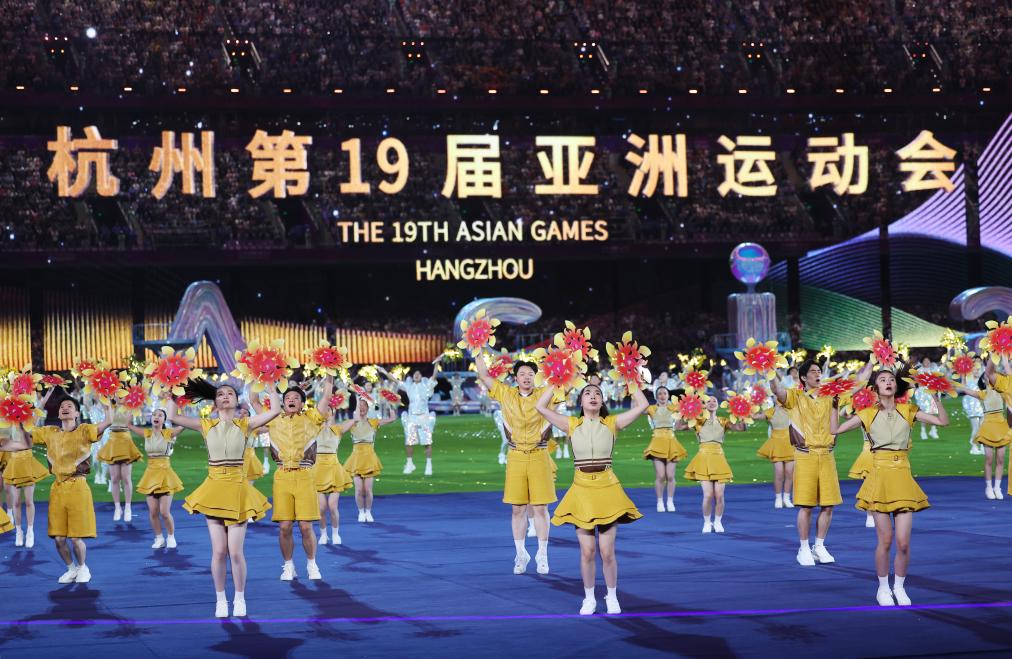 HANGZHOU, 8. Oktober 2023 (Xinhuanet) -- Schauspieler und Schauspielerinnen treten während der Abschlusszeremonie der 19. Asienspiele im Hangzhou Olympic Sports Center Stadium in Hangzhou in der ostchinesischen Provinz Zhejiang auf, 8. Oktober 2023. (Quelle: Xinhua/Huang Zongzhi)