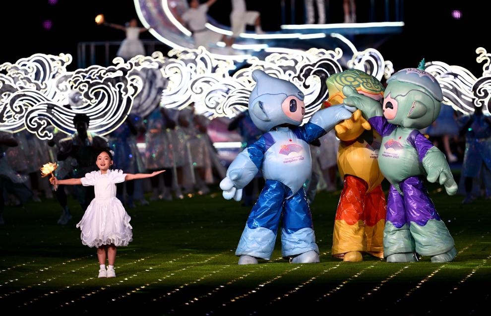 HANGZHOU, 8. Oktober 2023 (Xinhuanet) -- Schauspieler und Schauspielerinnen treten während der Abschlusszeremonie der 19. Asienspiele im Hangzhou Olympic Sports Center Stadium in Hangzhou in der ostchinesischen Provinz Zhejiang auf, 8. Oktober 2023.(Quelle: Xinhua/Xue Yuge)