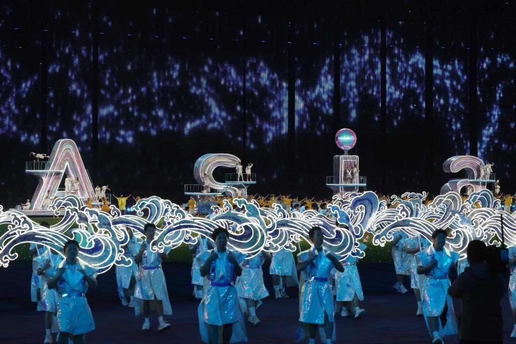 HANGZHOU, 8. Oktober 2023 (Xinhuanet) -- Schauspieler und Schauspielerinnen treten während der Abschlusszeremonie der 19. Asienspiele im Hangzhou Olympic Sports Center Stadium in Hangzhou in der ostchinesischen Provinz Zhejiang auf, 8. Oktober 2023. (Quelle: Xinhua/Meng Chenguang)
